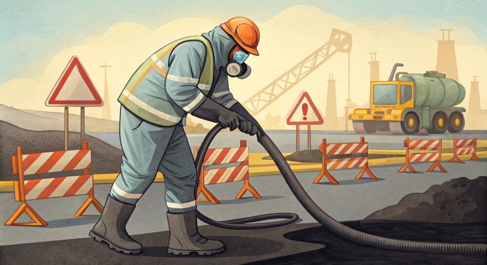 Для работы с битумом необходимо использовать оборудование, соответствующее стандартам и требованиям, такое как рукава и насосы, рассчитанные на работу с горячими материалами. - Как можно повысить безопасность работ с битумом?