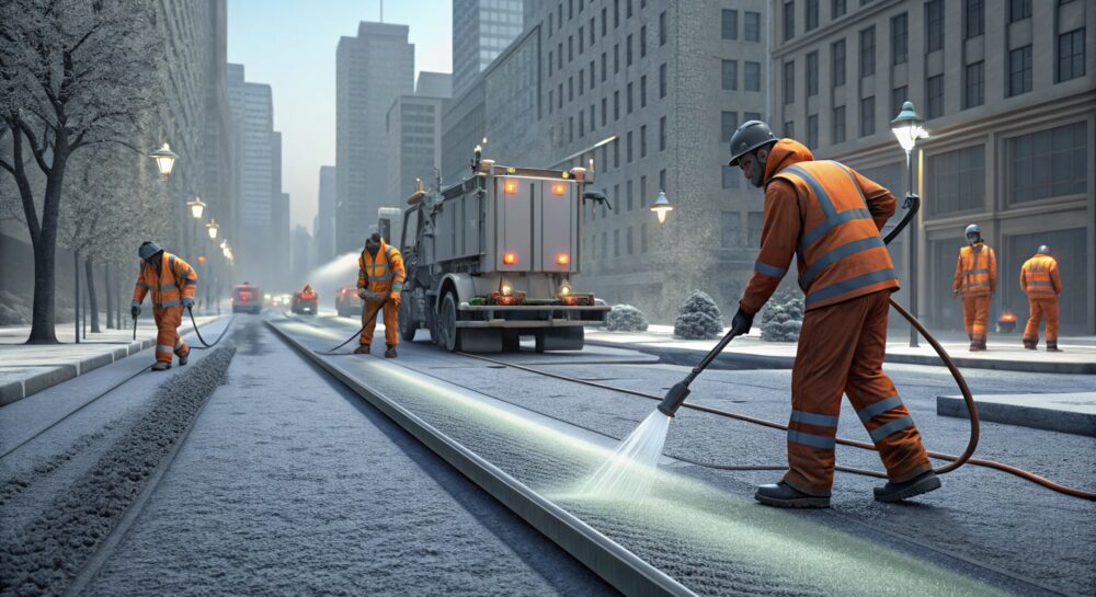 Перед тем как приступить к дорожной обработке резиновой крошкой, необходимо обеспечить идеальные условия для её сцепления. Очистка от снега и льда — обязательный этап, но не единственный. Влажность поверхности играет решающую роль: если дорога слишком мокрая, крошка не будет держаться, а если сухая — эффективность её антискользящего действия снизится.