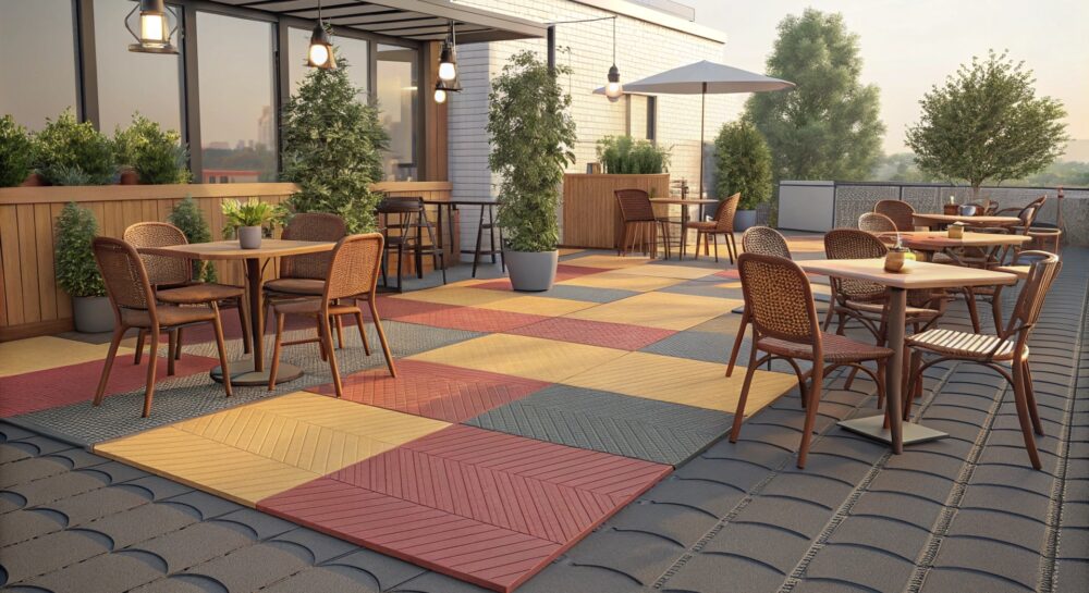 В отличие от бетона или дерева, резиновая плитка не нагревается под солнцем, не впитывает влагу и сохраняет комфорт для посетителей даже при высоких температурах. Она также прочность покрытия и устойчивость к механическим повреждениям — идеально подходит для заведений с высоким потоком посетителей. При этом простота монтажа и ухода делает её экономически выгодной в долгосрочной перспективе.