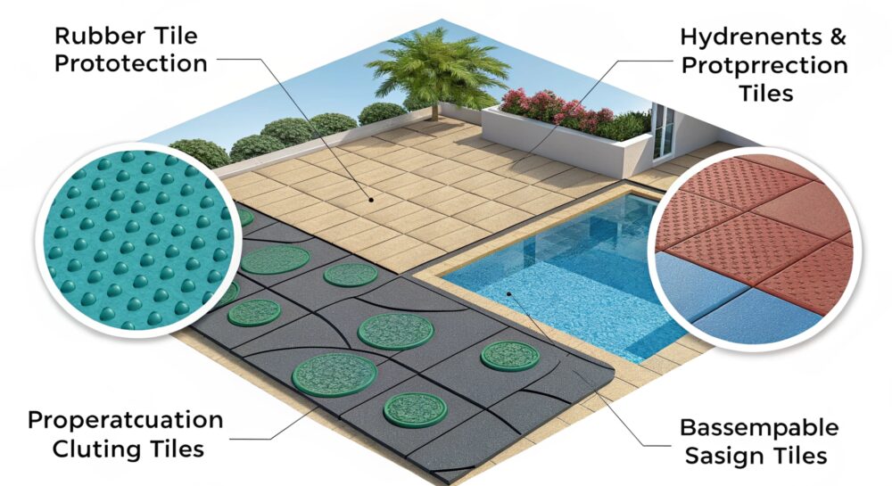 Резиновая плитка для защиты гидроизоляции бывает разных видов, и её выбор зависит от конкретных условий эксплуатации. Для бассейнов важно, чтобы материал не впитывал воду и не создавал скользкой поверхности. В этом случае подойдут плитки с гладкой или текстурированной поверхностью, обработанные антикоррозийными материалами и антисептическими добавками.